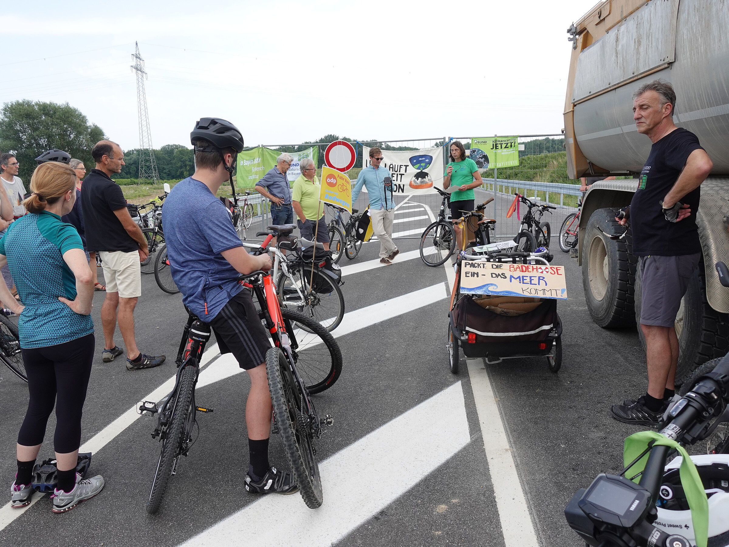 „Trotz Aussicht auf Gewitter und eine ziemlich knappe Organisationszeit waren es etwa 60-70 Menschen, die bei der ersten Fahrrad-Kundgebung in Deggendorf dabei waren“, freut sich Georg Kestel vom BUND Naturschutz Deggendorf über eine hervorragende Teilnahme an der Fahrt unter dem Motto „Klima schützen, Fahrrad nutzen“. Die Route führte von Deggendorf nach Plattling an die dortige Baustelle der Ost-Umfahrung. Angestoßen hatte die Fahrt Matthias Schwinger von den Grünen, zusammen mit der Aktionsgruppe Klimaentscheid Deggendorf hatte sich auch der BN dem Aufruf zu der Fahrt am Sonntag den 25. Juli noch kurzfristig angeschlossen.